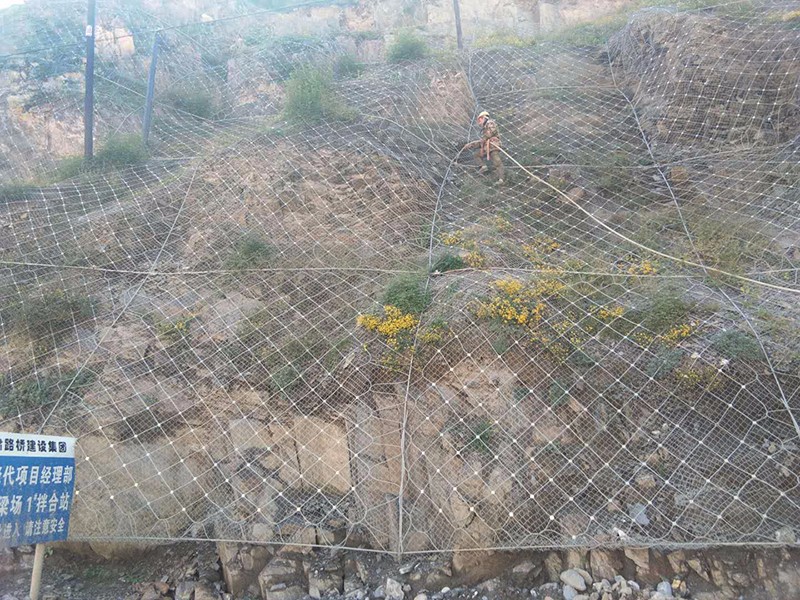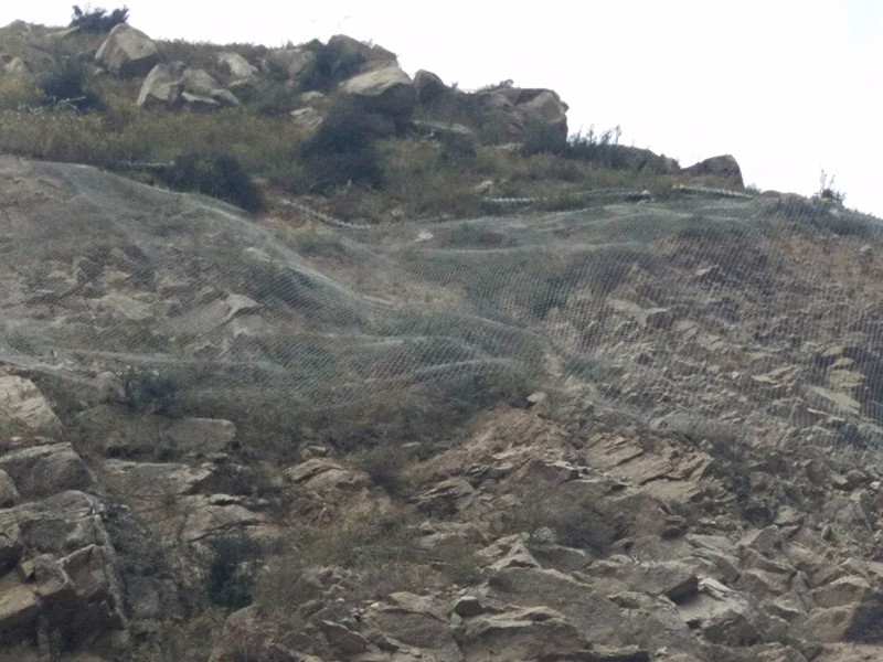 主動(dòng)防護(hù)網(wǎng)是用以鋼絲繩網(wǎng)或TECCO高強(qiáng)度鋼絲格柵網(wǎng)為主的各類(lèi)柔性網(wǎng)覆蓋或包裹在需防護(hù)的斜坡或危石上,以限制坡面巖土體的風(fēng)化剝落或破壞以及危巖崩塌(加固作用),或者將落石控制在一定范圍內(nèi)運(yùn)動(dòng)(維護(hù)作用)。
